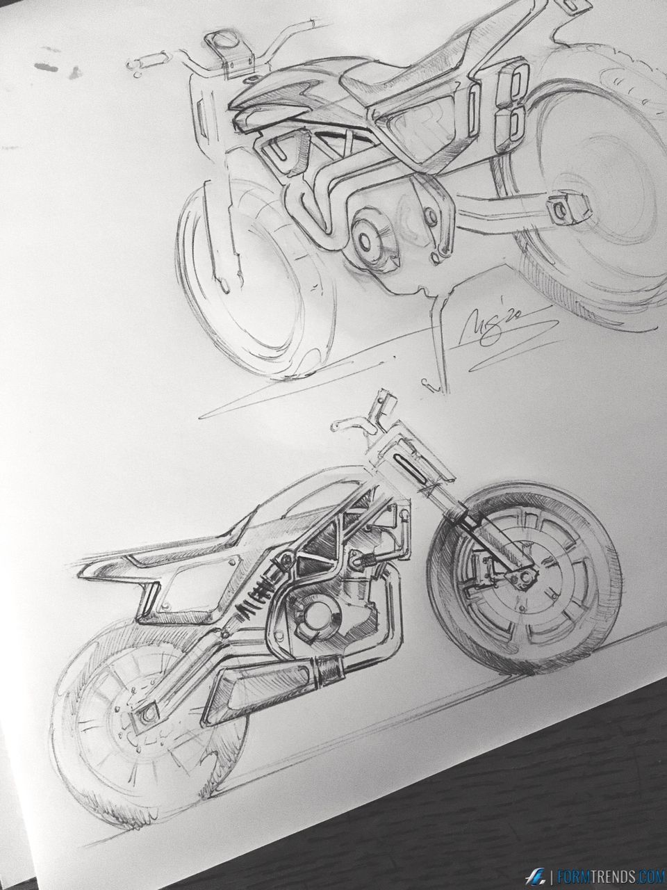 From a standing height, adults look across at cars, but down at motorcycles, at angles that produce extreme perspectives that contrast changes in plan and side views. There really is no way to see a bike in side view, so the plan view becomes critical if a dynamic, muscular design is to come across in the typical viewing angles it will be seen from.