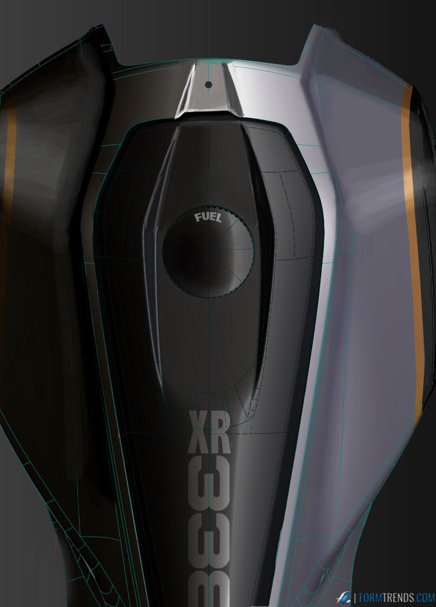 The XR338 design process placed a lot of focus on the rear three-quarter view, known as the approach angle. This is the last complete view of the bike the rider sees just before they mount a motorcycle. While most classically styled motorcycles have relatively little contrast in plan view, I like pinching bikes significantly around the front of the seat to create an exaggerated hourglass profile. Seen from behind, this has the effect of creating muscle without bloating the overall visual mass out of proportion, something that small motorcycles are particularly sensitive to.